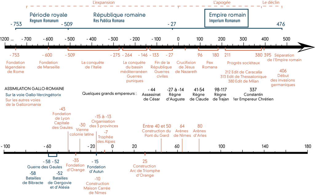 La Gaule devient romaine en 52 av. J.-C, après la reddition de Vercingétorix à Alésia. L’Empire romain s’écroulera en 476. Dix ans plus tard, Syagrius, un général romain qui avait maintenu une forme d’organisation romaine dans le nord de la Gaule, est vaincu par Clovis. On entre alors dans le Moyen-Age. Les vestiges des monuments par lesquels passe l’itinéraire appartiennent essentiellement à la période comprise entre ces événements clés. La plupart remontent au Ier siècle avant et après J.-C. hormis quelques sites comme Marseille, dont les premières traces d’occupation remontent à 600 ans avant notre ère. En tout cas, ces sites appartiennent tous à l’antique « Gaule chevelue », comme l’appelait Pline, et se concentrent essentiellement dans la Lyonnaise et la Narbonnaise.